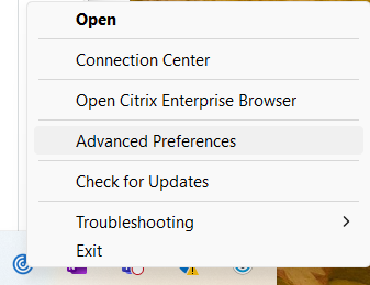 - Right click on the Citrix Workspace App icon and select Advanced Preferences: